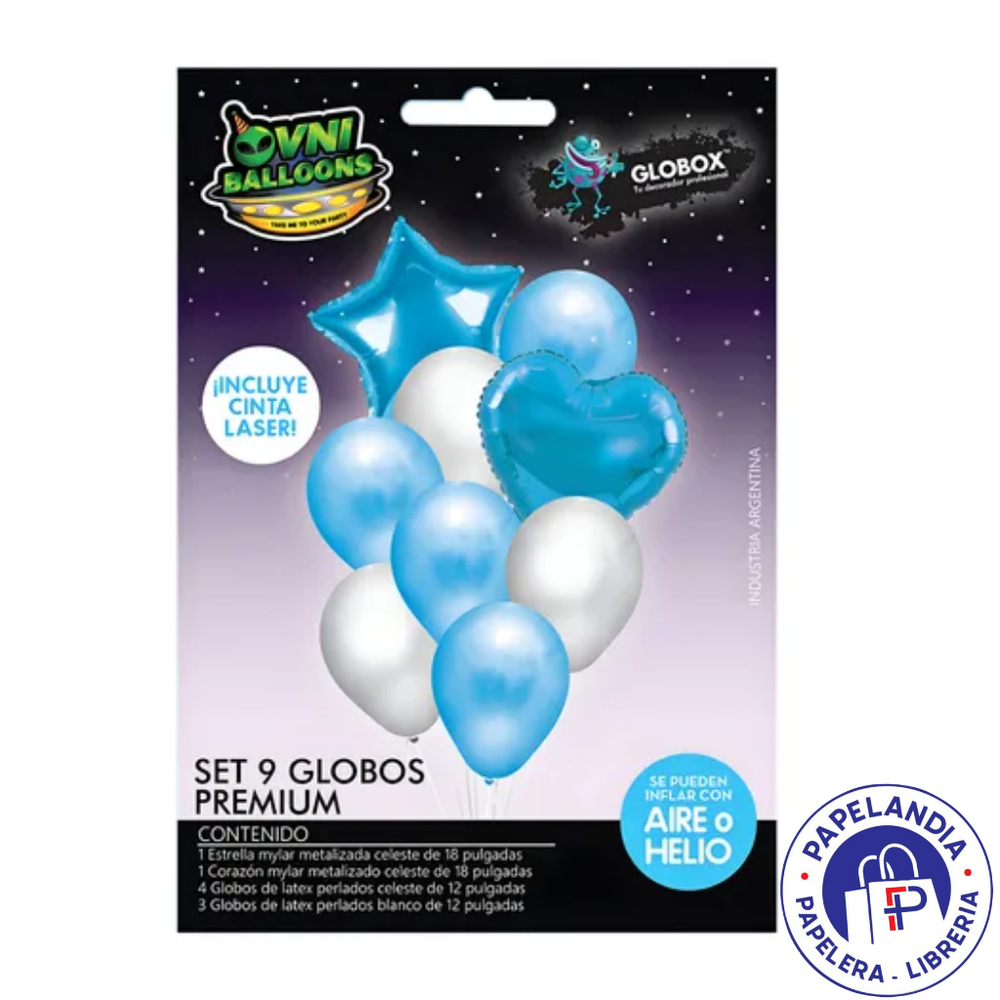 KIT GLOBOS DECO OVNI PREMIUM ESTRELLA/CORAZON CELESTE/BLANCO X9 (APTO HELIO) 72225