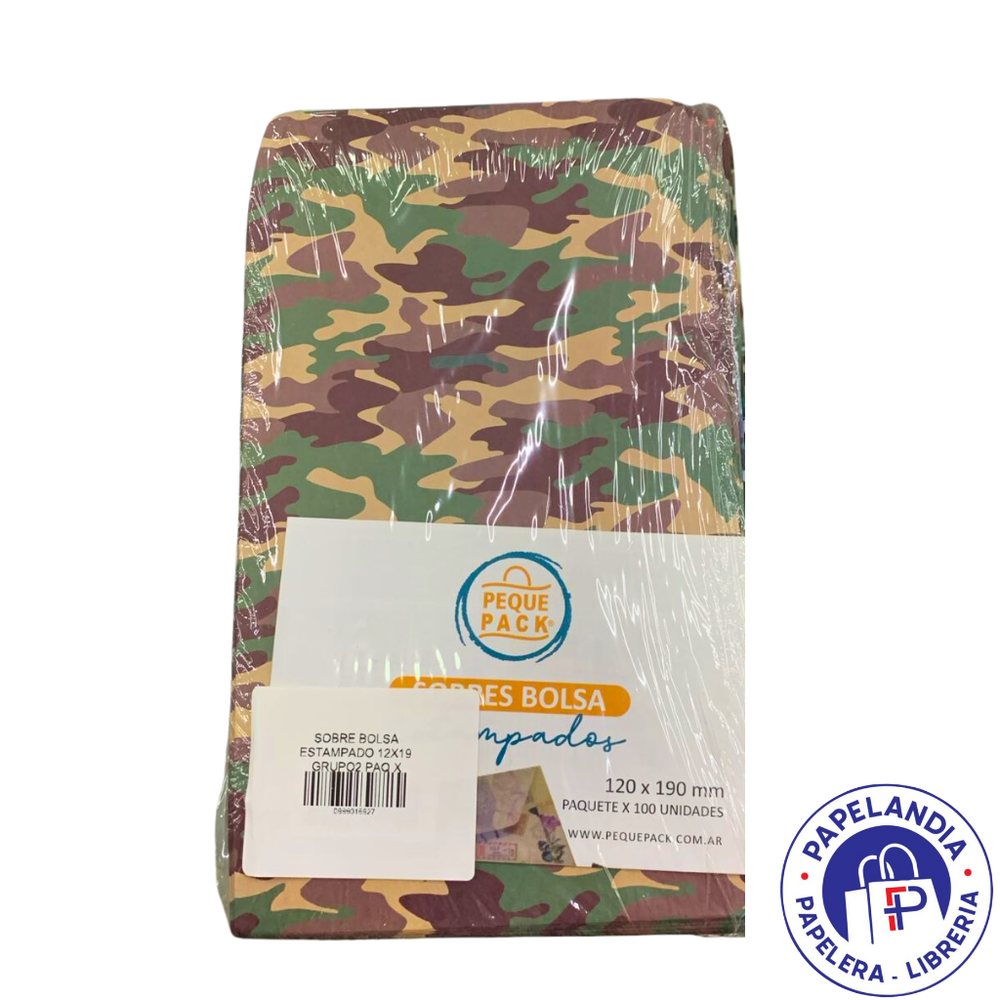 SOBRE BOLSA ESTAMPADO 12X19 (CAMUFLADO BIGOTES PELOTAS) PAQ X 100 (H1)